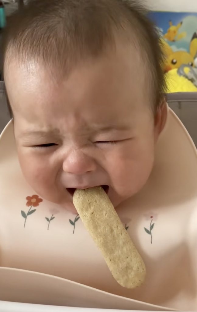 せんべいの方に視線を向けながら、懸命に何度もお口を大きく開けてチャレンジする赤ちゃんですが、なかなか食べ進めることができません。赤ちゃんの表情がだんだん険しくなっていき、ついに泣き出してしまったところで動画は締められました。