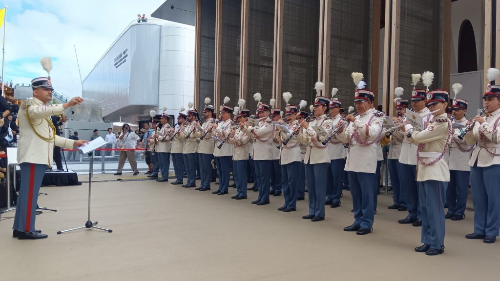 パビリオンの前には、この日限定で特設スケートリンクが現れ、イタリア陸軍音楽隊によるプッチーニ作曲のオペラ「トゥーランドット」のアリアに乗せて関西大学アイススケート部がエキシビションを披露した。
