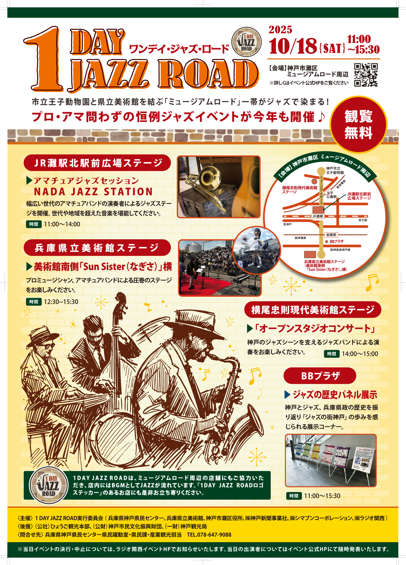 当日は、県立美術館、JR灘駅北駅前広場、横尾忠則美術館の各ステージで、幅広い世代のアマチュアバンドや、港町のジャズシーンを支えるジャズバンド、プロミュージシャンが一堂に会し、ライブを披露します。