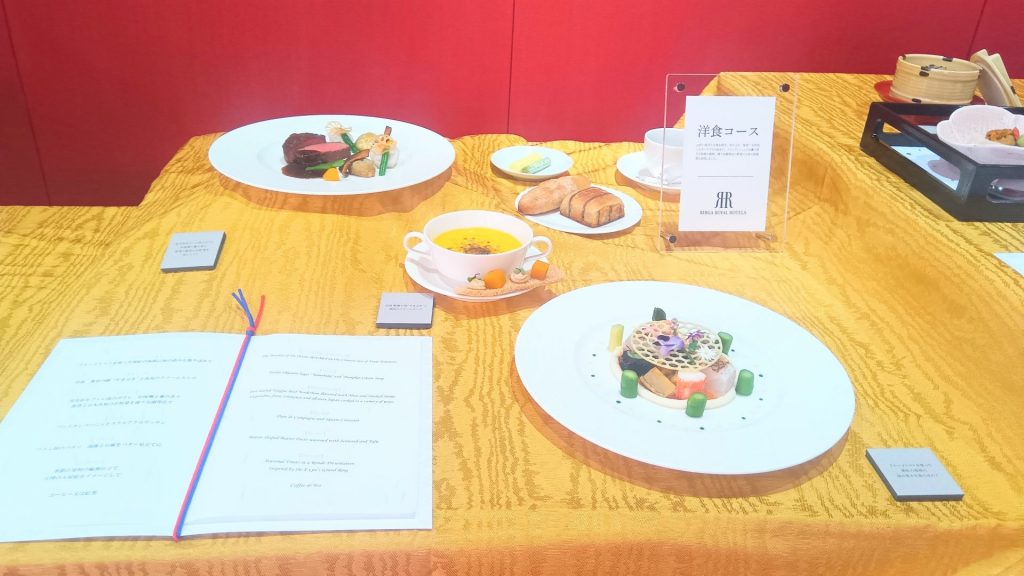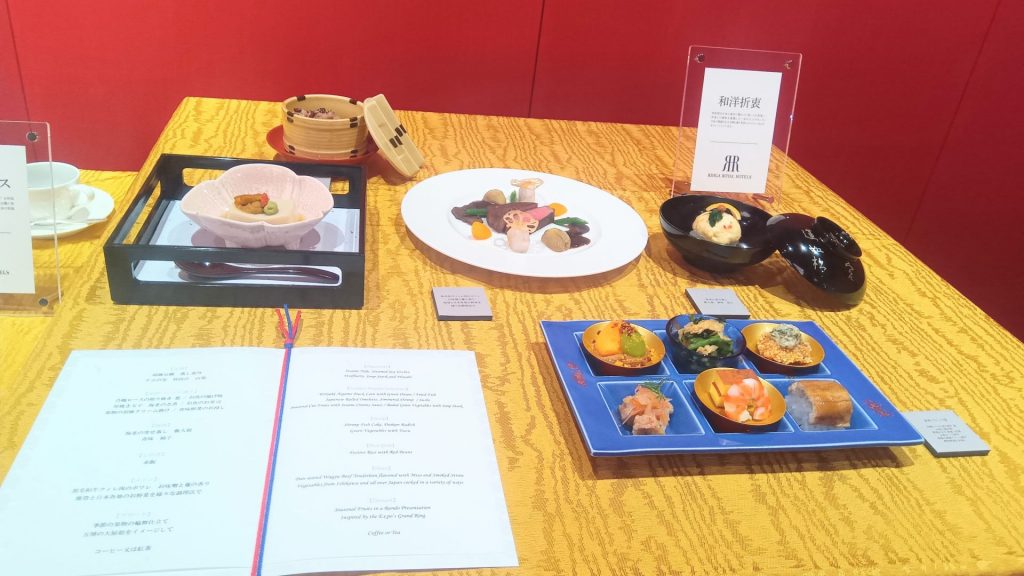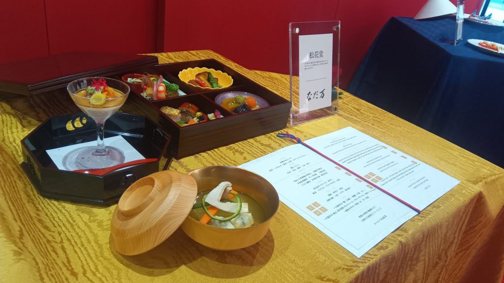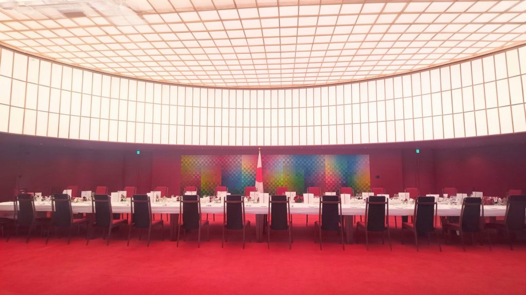 食事はリーガロイヤルホテルグループ(和洋折衷・洋食)、老舗料亭「なだ万」(和食)が担当し、各国が事前に選択する形式を取った。乾杯は日本酒。