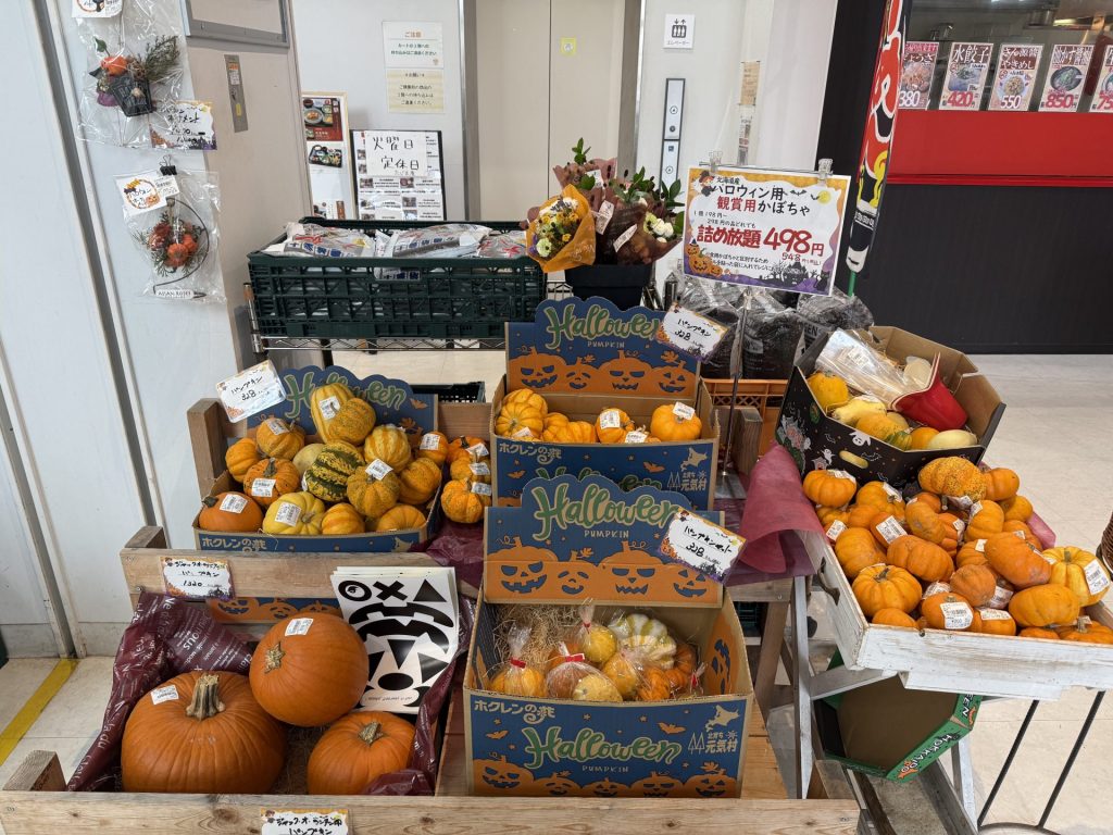 大きなかぼちゃ以外にも生花コーナーにはハロウィンコーナーが充実。コロンと置くだけでかわいらしいかぼちゃは、さまざまな色・形があり選ぶだけでも楽しめます。