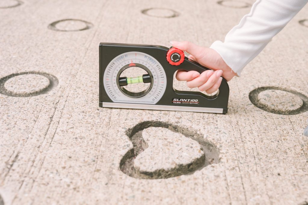 ちなみに神戸市の平均傾斜は4.4度。これは全国平均の約10倍なんです! 傾きを測る器具「スラント」で測ってみたところ、恋訪坂の勾配は11度でした。