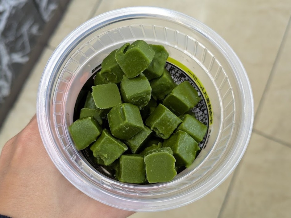 話題の商品、「宇治抹茶スムージー」(税込400円)。購入した冷凍カップの中には、抹茶生チョコのような見た目の固形物がたくさん入っています。
