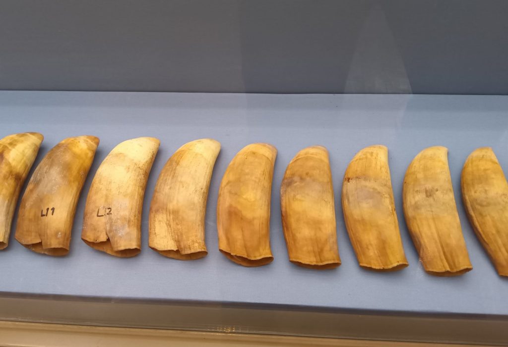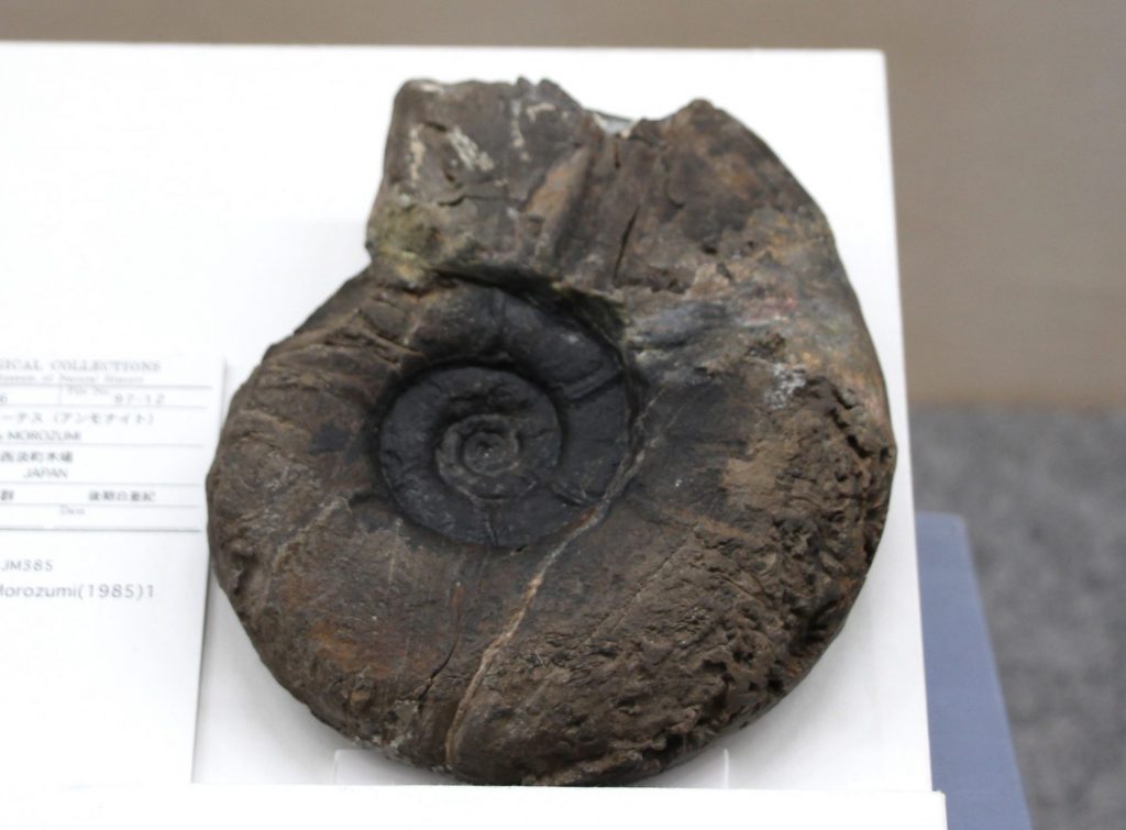 「標本」を主軸に学芸員の仕事を「集める」「守る」「調べる」「伝える」などに分けてひもとく。「集める」では、昆虫や植物、魚、哺乳類、化石、岩石など、多種多様な標本がいかに採集・作製・保存されているかを解説。チョウの乾燥標本やイカの液浸標本、和泉層群のアンモナイト化石などさまざまな標本や、収集のためのユニークな道具類も並ぶ。新しく収蔵された標本のエリアでは、専門家やアマチュア研究者の手による膨大なコレクションや、2021年、大阪湾に漂着したニタリクジラの巨大な頭骨、2024年に死んだマッコウクジラの歯なども公開。クジラはいずれ大阪市立自然史博物館の担当者らによるチームが数年がかりで標本化したものだ。