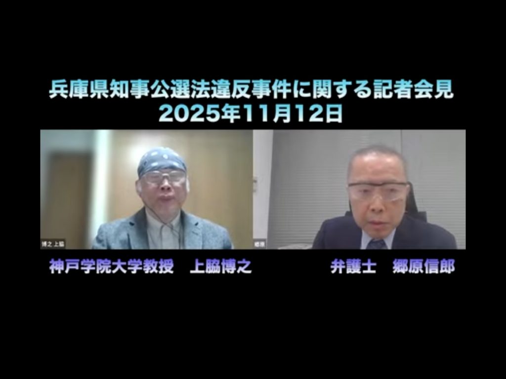斎藤・兵庫県知事ら不起訴「納得いかない」郷原弁護士、上脇教授が検察審査会に申し立てへ 2025/11/13 (写真2枚) 斎藤元彦・兵庫県知事とPR会社の女性社長(同県西宮市)の公職選挙法違反容疑について、神戸地検が12日、いずれも不起訴(嫌疑不十分)としたことを受け、2人を刑事告発した元東京地検特捜部検事・郷原信郎弁護士と上脇博之・神戸学院大学教授が同日、これを不服として近く検察審査会に申し立てる方針を明らかにした。 記事全文を読む 関連記事 斎藤・兵庫県知事、PR会社社長とともに不起訴 知事選めぐる公選法違反容疑「報酬、対価に疑義」 2025/11/13 「針の穴に糸を通す弁解」斎藤・兵庫県知事 公選法違反疑惑、告発状 郷原信郎弁護士・上脇博之教授 2024/12/02 PR会社経営の女性「盛っている?」斎藤・兵庫県知事代理人「事実ではない」公選法違反を否定 2024/11/28 斎藤・兵庫県知事、PR会社女性社長 公選法違反容疑で書類送検 有償で知事選広報戦略委託か? 2025/06/20 兵庫県告発文書問題・知事選挙めぐり告訴・告発された全7件、嫌疑不十分で不起訴に 神戸地検 2025/11/13