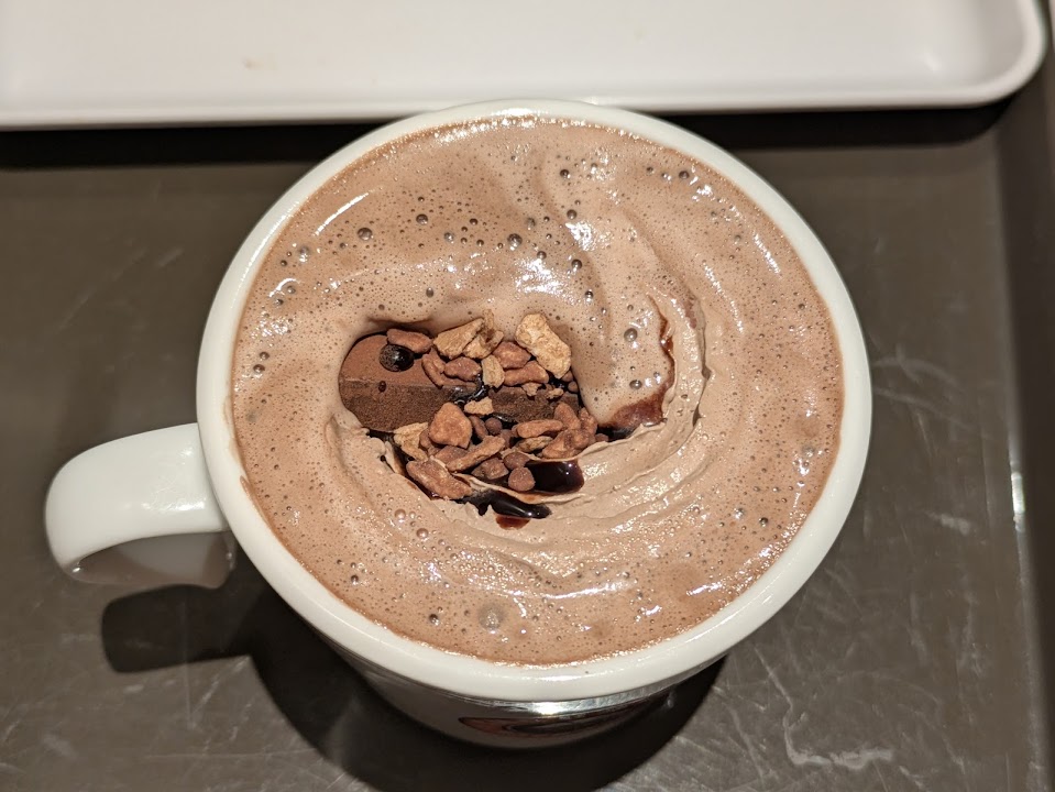 というのも、ホットドリンクゆえに、溶けだしたチョコレートがホットチョコをさらに甘くて濃厚な味に仕上げてくれるんです。「ラテ」ではなく「ホットチョコ」なので、まるで、ひとつのケーキを完食したような満腹感を与えてくれますよ。