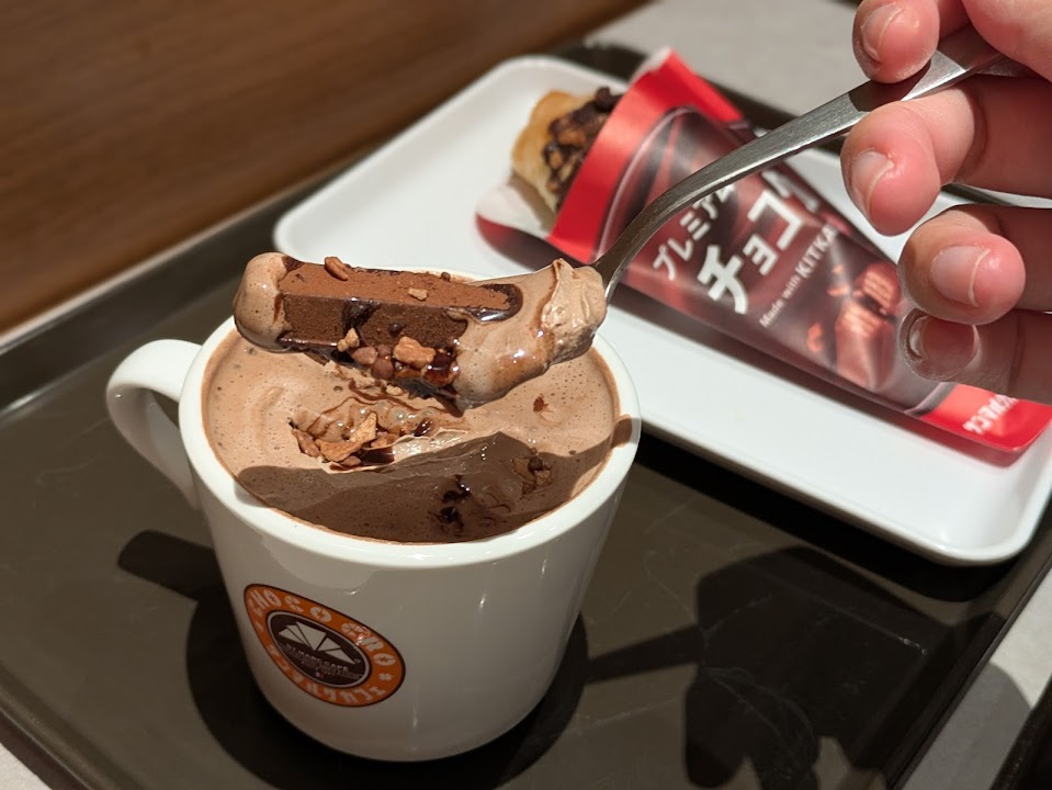 これからの寒い季節にぴったりなのが、「プレミアムホットチョコ Made with KITKAT」(税込620円)。生クリームを配合した濃厚ホットチョコの上には、キットカットがまるごと乗せられています! コラボの名に恥じぬ豪快なビジュアルは、写真映え間違いなしですね。