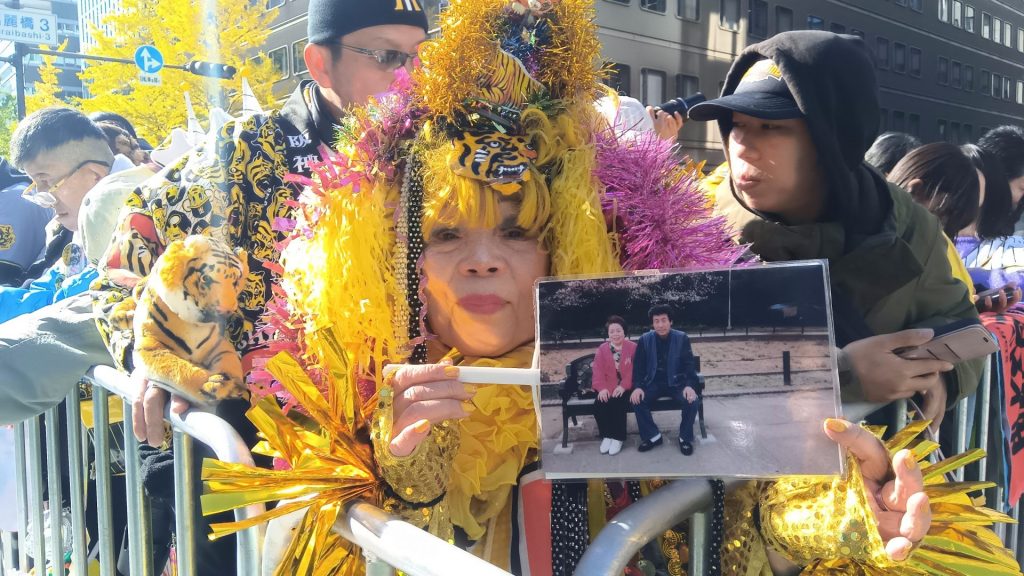 「タイガースの快進撃が、私を元気づけてくれた」。1999年に先立った夫とのスナップ写真を片手に、タイガースカラー・黄色のかつらとトラ柄の羽織に身を包み、前日の午後11時に御堂筋へ。淀屋橋で夜を明かした。