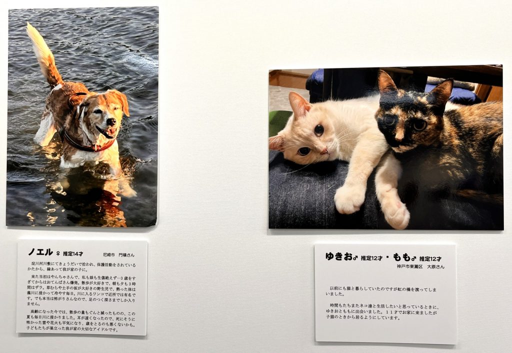 また、高齢の飼い主と高齢ペットが互いに支え合いながら築いた絆を伝える「高齢者とペットの今をみつめて」コーナーも。高齢者の死亡などにより、保護された犬猫、とりわけ高齢の犬猫が、65歳以上の新たな飼い主のもとで、幸せに暮らしている3事例を12点の写真で紹介。人間と犬猫それぞれが高齢になった場合、どのような関わり方が理想であるのか、考えさせられる展示となった。