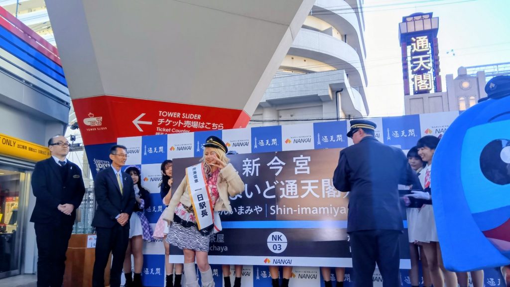 その後、新今宮駅コンコースやホームで「#まいど通天閣」のPR。「『ハッシュタグ、天下!』って感じ」とコメントした。