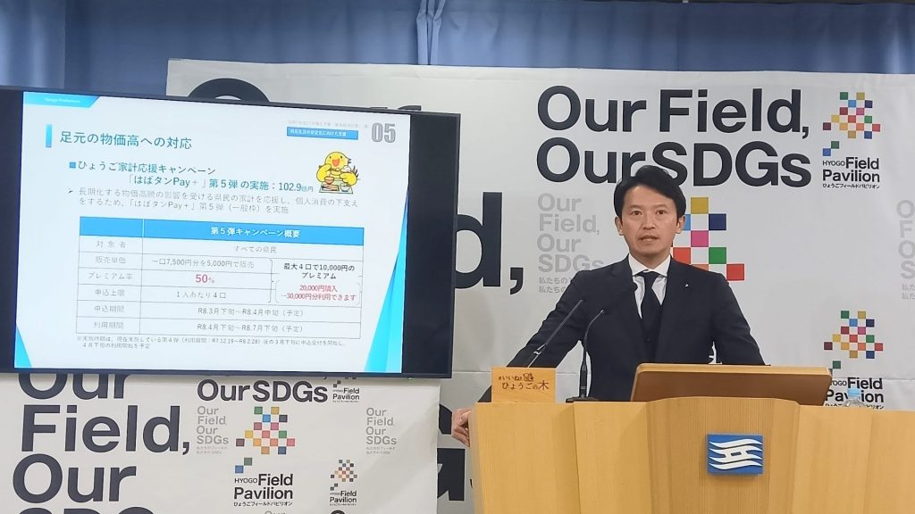 斎藤元彦知事は11日、「一番のポイントははばタンPay+(プラス)。物価高対策として県民の皆さんの生活支援が大事。養殖マガキが大量死している問題については、大切な県の地域産業であるカキの生産を維持するため、漁業協同組合への支援で種苗の確保やPRなど柔軟に対応できるようにする」と話した。