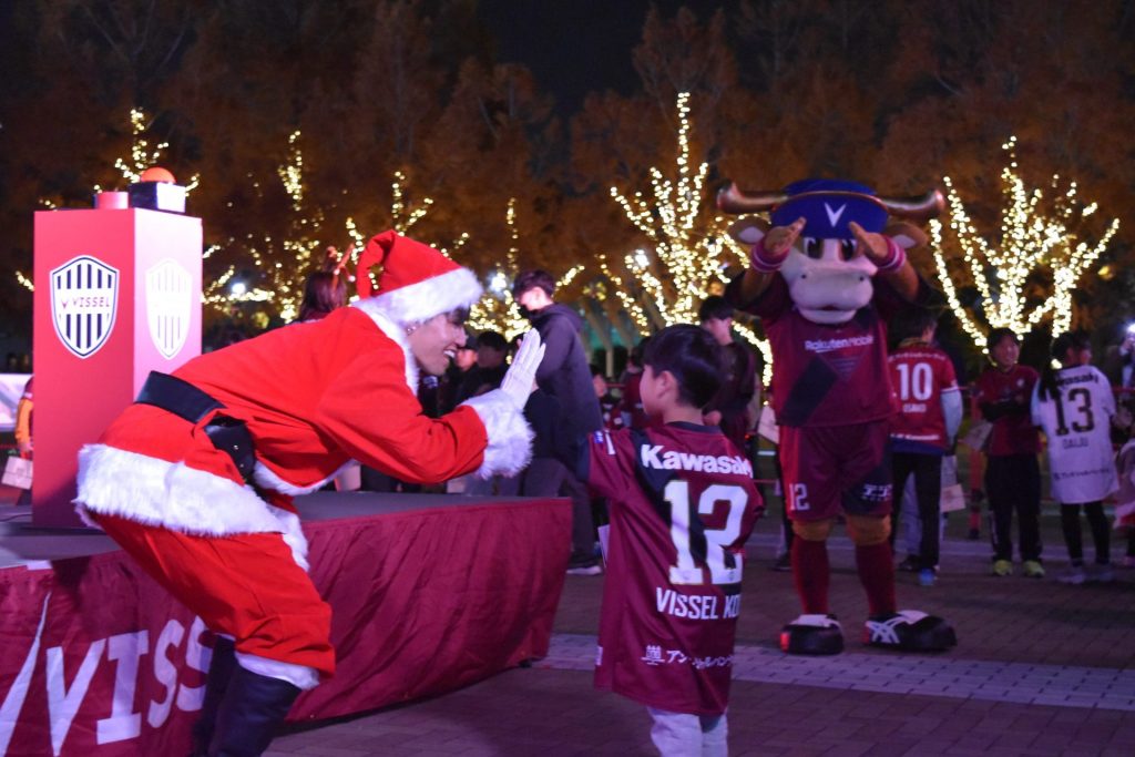 当日はサンタ姿で登場し、集まったヴィッセル神戸ファンクラブ会員らの前で、少年時代のクリスマスエピソードを明かした佐々木選手。ライトアップ点灯の大役を担うとともに、子どもたちにプレゼントを配るなど、交流を深めました。
