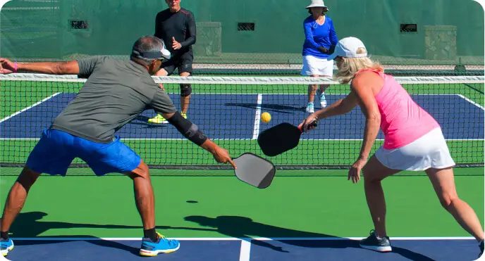 アメリカではおもに屋外でプレーします。オフィスビルの広間にコートが設けられている場合もあり、ビジネスパーソンが休み時間や仕事終わりにピックルボールで親交をはかることも日常になってきているのだとか。一方、日本では体育館が一般的なようです。国内にはピックルボールのサークルを立ち上げた大学もあるそうです。ちなみに、コートの広さはバトミントンで使うものと全く同じとのこと。