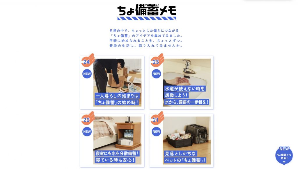 皆さん、いろいろと試行錯誤している様子がアンケートから見えてきました。一方で、より気軽に防災に取り組んでもらおうと、ちょっとした工夫や発想の転換のヒントを発信している企業もあります。