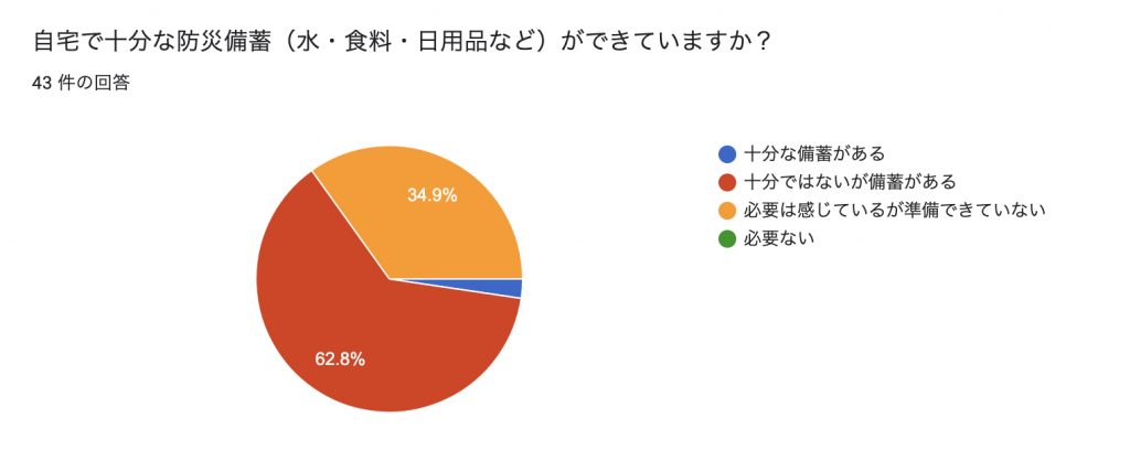 アンケートをみてみると、実際に「十分な備蓄がある」と答えたのは1人だけで、「十分ではない」と答えた人が62.8%(27人)、「必要は感じているが準備できていない」という人も34.9%(15人)という結果でした。