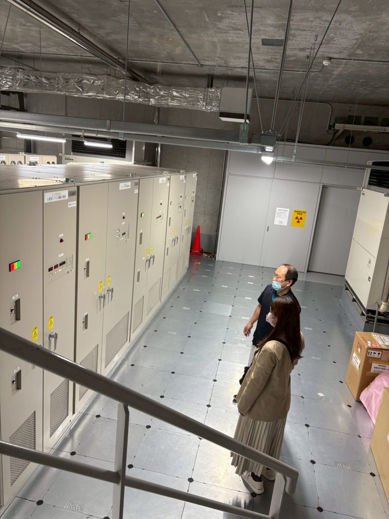 加速器の説明を受ける筆者 この装置を使い、陽子線のエネルギーを高めている