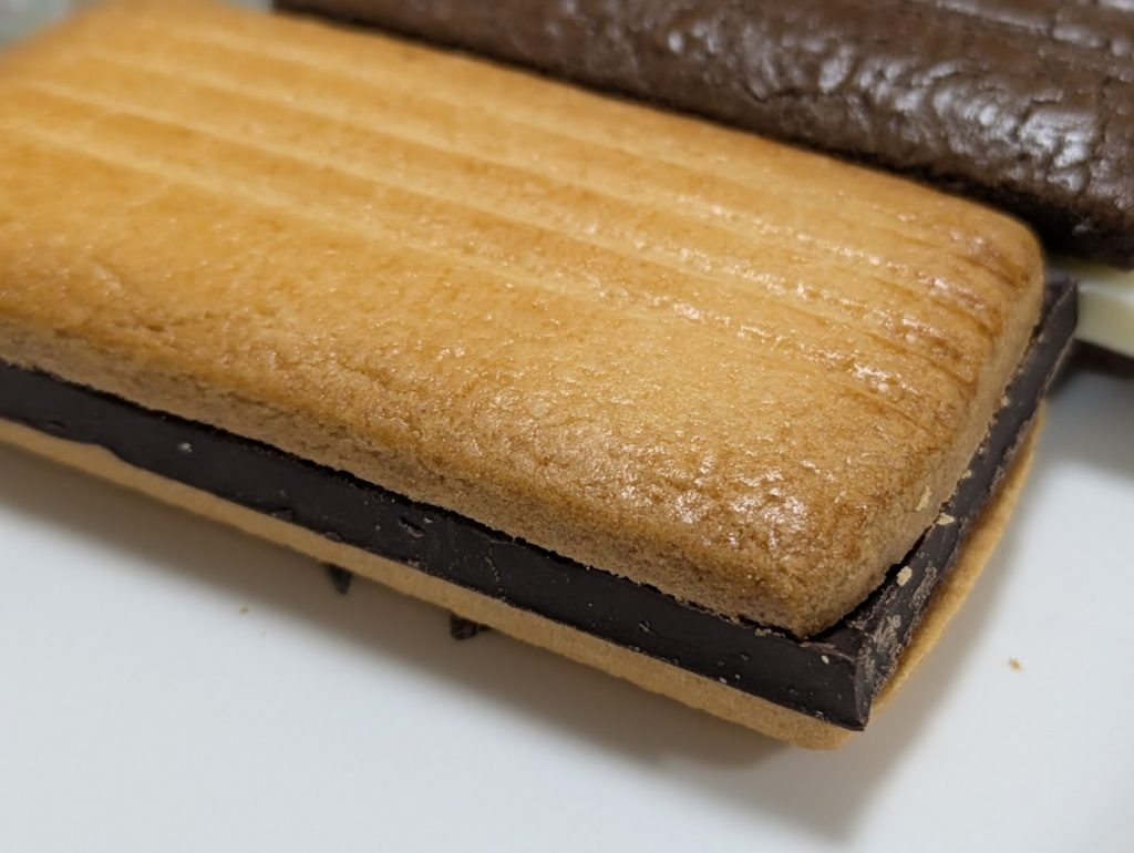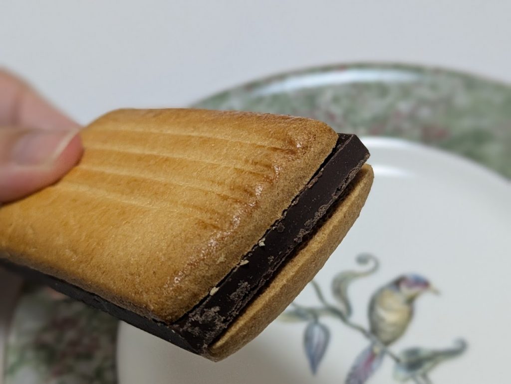 「ビターチョコサンドクッキー」(税込250円)は、約4.5センチ×8.5センチほどのサイズ感。手に取ると、クッキーの間に挟まれた極厚のビターチョコレートのずっしり感に驚かされます。市販の板チョコよりも分厚いそのビジュアルで、主役といわんばかりに存在感抜群です。