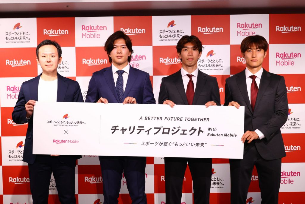 写真左から、NPO法人AYA代表の中川悠樹代表、東北楽天ゴールデンイーグルスの早川隆久投手、ヴィッセル神戸FW宮代大聖選手と同MF鍬先祐弥選手(写真提供:楽天グループ)