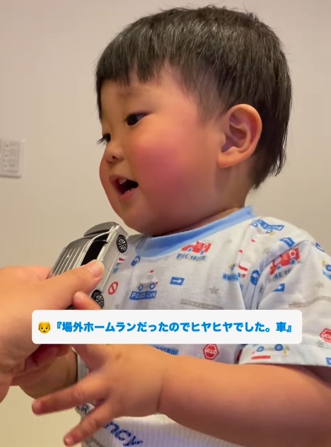 「じゃあ…今日ホームランを打った気持ちを教えてください!」とママが続けると、りゅうせい君は「あ~か~あ~……ブーブ(場外ホームランだったので、ヒヤヒヤでした…車)」と、食い気味に答えます。語尾には、ついつい「ブーブ(車)」と、言ってしまう可愛らしいりゅうせい君。