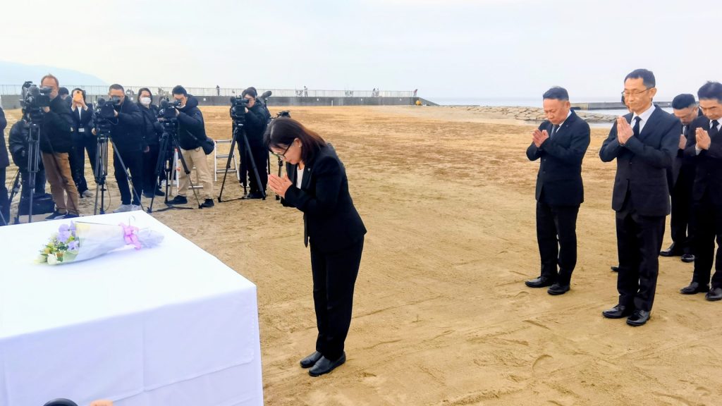 明石・大蔵海岸砂浜陥没事故24年 「安全・安心を基軸に」丸谷聡子市長ら献花、市民守る決意新たに 2025/12/30 (写真7枚) 2001年、兵庫県明石市の大蔵海岸で起きた砂浜陥没事故の発生から24年を迎えた12月30日、丸谷聡子・明石市長と市幹部らが事故現場を訪れ、献花した。 記事全文を読む 関連記事 “関西人の住みたい街” 1位は梅田 明石市は初の3位 暮らす街の選び方は「都度最適」が主流に 2023/08/22 タウンミーティング、予想超えた反響 ”みんなでつくる明石” 丸谷聡子市長「対話の文化、つくります!」 2023/06/01 市民とつながる”タウンミーティング” 続いてます!「街は“市民目線”で…」丸谷聡子・明石市長 2024/06/14 明石・大蔵海岸砂浜陥没事故23年 「子ども失った親の気持ち、身に染みて…」丸谷聡子市長ら献花 2024/12/30 《明石歩道橋事故23年》遺族の思い「本当は来たくない、でも引き戻されて」「今年も謝りに…」 2024/07/22