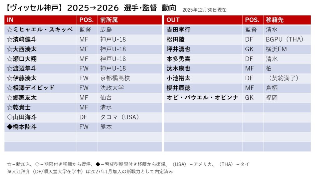 サッカー・J1のヴィッセル神戸は、2025年最後の1週間も、来るべき新シーズンに向けての動きを活発に行っていました。12月25日から30日にかけては、元W杯戦士の加入や、J2で主力として活躍したマルチローラーのクリムゾンレッドへの帰還などが発表されています。
