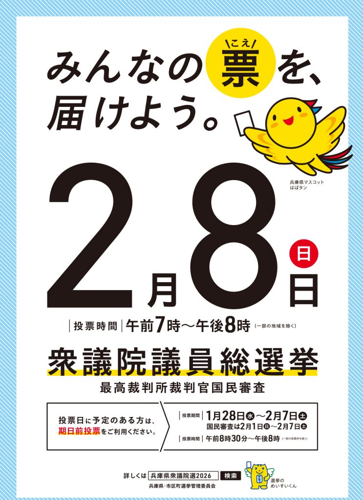 【第51回衆議院議員総選挙】2月8日投票 神戸・三宮&ジーライオンアリーナ神戸で投票啓発 PR 2026/02/04 (写真2枚) 2月8日(日)は、第51回衆議院議員総選挙の投票日。兵庫県では投票率向上と「明るい選挙」の実現に向けて、県内各地でさまざまな啓発活動が展開されています。 記事全文を読む 関連記事 「1票の大切さを認識して投票へ」 明るい選挙呼びかけシンボル旗を掲揚 兵庫県庁 2026/01/26 投票日、朝1番乗りが行う特別な“任務”とは? 神戸市内で選挙啓発イベント 模擬投票に254人参加 2026/02/02 どデカい!広大な選挙区巡ってみた←全然違う環境や文化…「立候補者も大変やなあ」衆議院選挙2026 2026/01/31 「あなたの、強き一票を。」 阿部一二三選手・詩選手が呼びかけ (2025年) 2025/10/14 若者の投票率向上へ 兵庫・神戸で選挙の啓発イベント(2025年) 2025/07/15