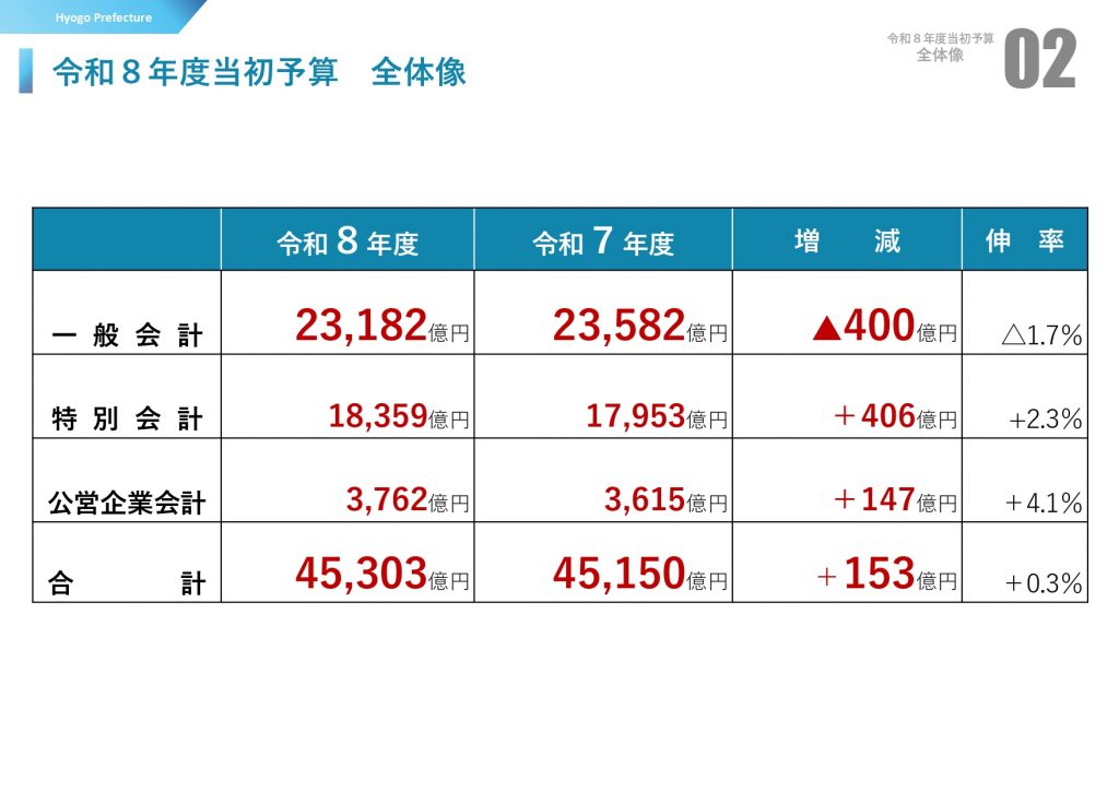 『未来へつなぐ 躍動予算』兵庫県 過去最高税収も、収支不足は大幅悪化 2026年当初予算案 2026/02/13 Prev 68/13 Next 記事を読む 関連記事 「新たな躍動が広がる兵庫」 新年度予算案説明 県立大学の授業料無償化を拡大 斎藤兵庫県知事 2025/02/13 “新時代挑戦予算”スタート 斎藤兵庫県知事が意欲「子どもを産み育てやすい兵庫に」 万博見据えて決意も 2023/04/13 兵庫県『新たな躍動づくり予算』2025年度当初案 県立大無償化、大阪・関西万博に対応 2025/02/12 住民の声を県政に「躍動カフェ」スタート 尼崎、西宮、芦屋の住民らと意見交換 斎藤元彦・兵庫県知事 2023/07/14 斎藤・兵庫県知事“女将の会”と万博ソング踊る! 大阪・関西万博「ひょうごフィールドパビリオン」 2025/06/01