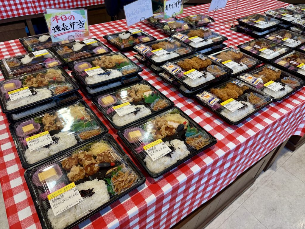 惣菜コーナーに並ぶ弁当は、味噌カツ・シュウマイ・唐揚げ・照り焼きなど種類豊富。いずれも前日から丁寧に仕込まれた「手作り惣菜」が主役。