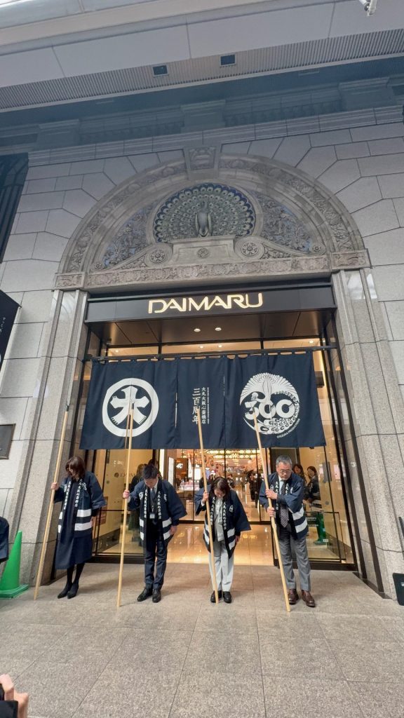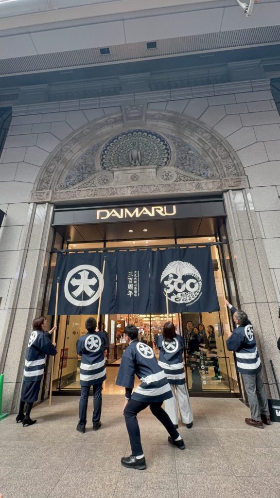 のれんには、「丸に大」の従来のロゴマークと手塚治虫さんの作品「火の鳥」が描かれた開業300周年ロゴを配した。