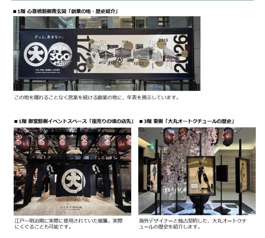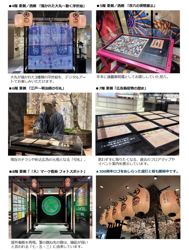 1階イベントスペースに江戸・明治時代の“座売り”の店先を再現し、各階エスカレーター前で明治時代にノベルティーとして配布していたすごろくやチラシ、大正から昭和時代の広告ポスターなどの資料を展示する。