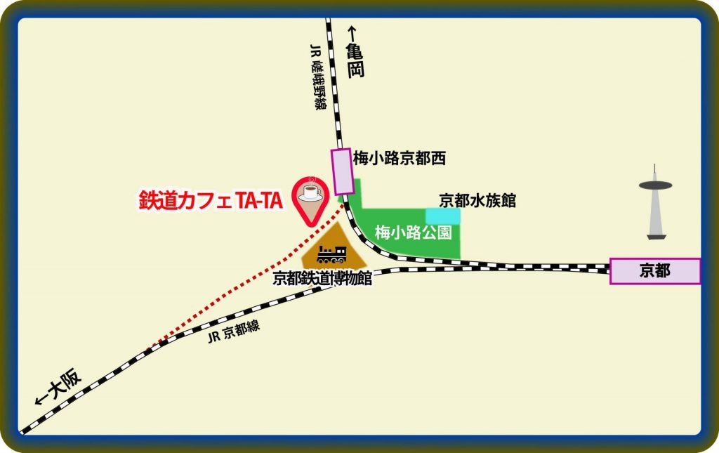 世に鉄道カフェと名乗る店は数多くありますが、ほとんどが鉄道模型のレイアウト中心の展開です。しかしこれから紹介するお店は、それらとは一線を画します。完全なるまでの鉄道部品・備品のオンパレード。よくぞここまで集めたなと鉄道マニアも唸(うな)る“パーフェクトワールド”が広がっているんです。しかも、場所はJR嵯峨野線「梅小路京都西」駅から歩いて5分ほど。そう、あの鉄の聖地・京都鉄道博物館のすぐそばに位置しているんです。