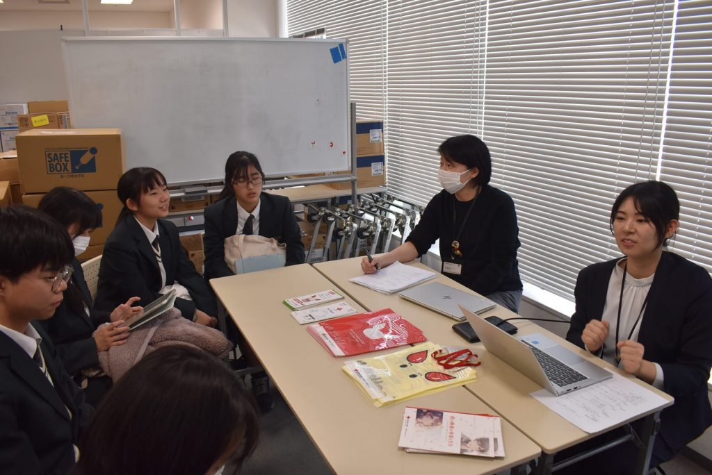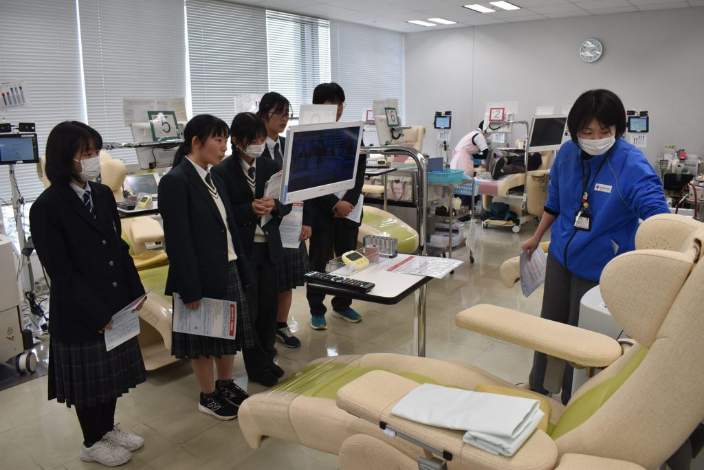 見学に先立って、「ミント神戸15献血ルーム」を運営する兵庫県赤十字血液センターの山野菜緒さんと池田恵理子さんから献血に関するレクチャーを受講。そもそも献血とは何か、どれくらい輸血を必要としている人がいるか、献血の種類で「全血献血」と「成分献血」(血液の中から特定の成分だけを採血)があること、献血の流れ、1人が1年にできる献血回数など……映像資料も使った解説に、生徒たちは熱心に耳を傾けます。