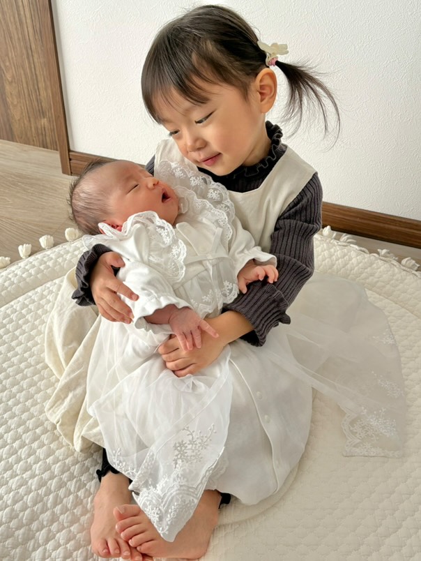 「とても仲良し姉妹です。なのはは妹がお腹にいるときから生まれてくるのを心待ちにしていて、生まれてからはとても大事にしてくれて、ミルクやお風呂、おむつ替えや着替えなど、なんでも『なのがする!』と言ってくれます。