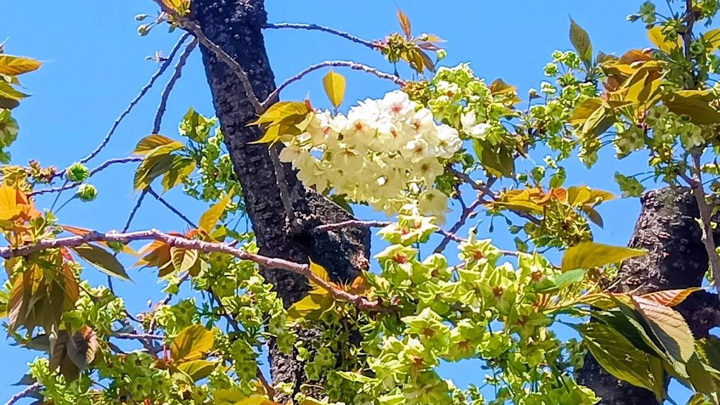 造幣局が例年、数多くの品種のうちから1品種を選ぶもので、御衣黄は花が黄緑色で、開花が進むにつれて花弁の中心に紅色の縦線が現れる珍しい品種。花弁の数は15枚程度。