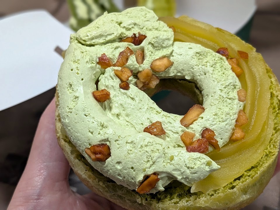 中には、ねっとり濃厚な栗あんと宇治抹茶ホイップがぜいたくにサンドされており、アーモンドの食感と香ばしさがいいアクセント。抹茶特有の渋みは抑え、リッチな和スイーツとしての完成度の高さが追究された商品でした。