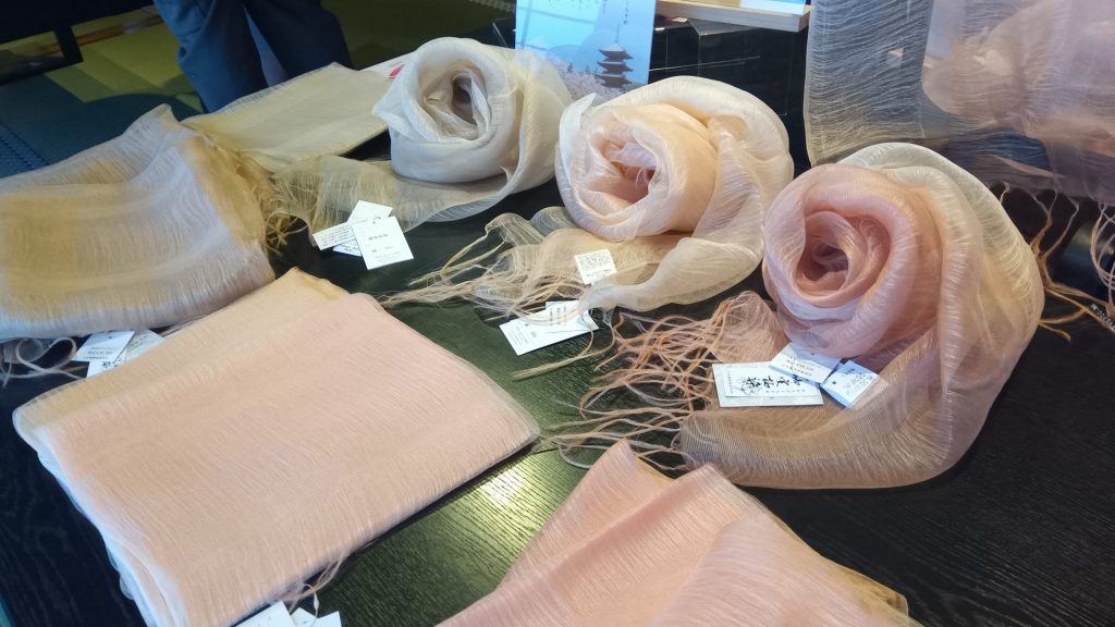 仁和寺・白書院で展示・即売されているストール〈2026年4月12日撮影 京都市右京区〉