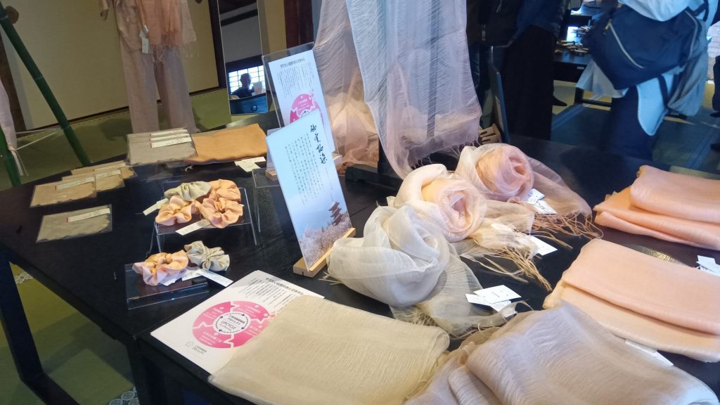 桜の枝から淡い桜色だけでなく、薄いピンクや鮮やかなオレンジ、グレーなど多様な色を引き出すことができる草木染めで、売り上げの一部は御室桜の保存に活用される。