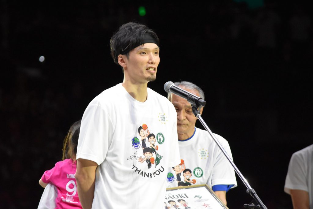 初年度から15年にわたってクラブ一筋で歩んできた谷選手。ホームラストゲームで先発に名を連ねると、その背番号9がチーム最初の得点を決めるなど奮闘を見せた。そんなレジェンドの活躍に触発された選手たちも実力を発揮し、相手を終始リード。前日の試合で課題だったディフェンス面も改善し、熊本を寄せ付けず。最後は谷選手と、同じく草創期からクラブを支えてきた道原紀晃選手がコートに並び立ち、試合を締めくくった。