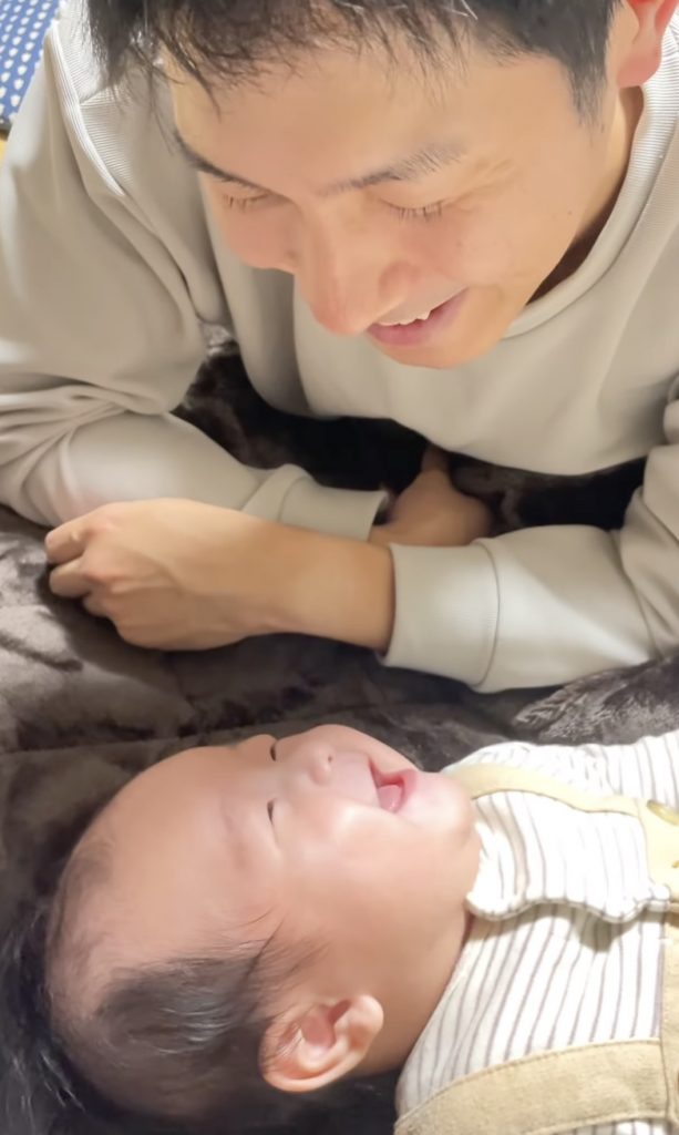 この日、生まれて初めて声をあげて笑ったという勘ちゃん。愛らしい笑い声をあげながら、全身で喜びを表現する勘ちゃんに、パパも喜びが溢れた優しい笑顔を見せます。