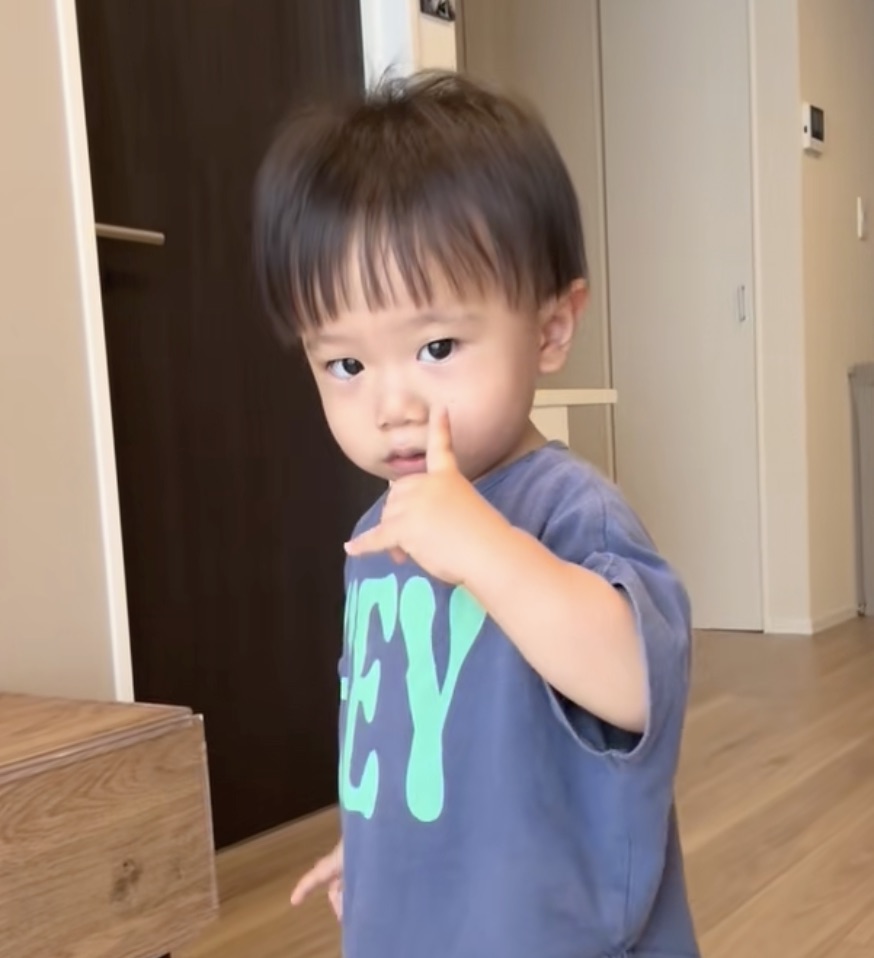 すぐに、ピンと立てた人差し指を顔の近くに持っていき、「1(いち)」のポーズを格好良く決める男の子。表情もどこか凛々しい…!完全には折り曲げられていない小指も愛らしく映ります。