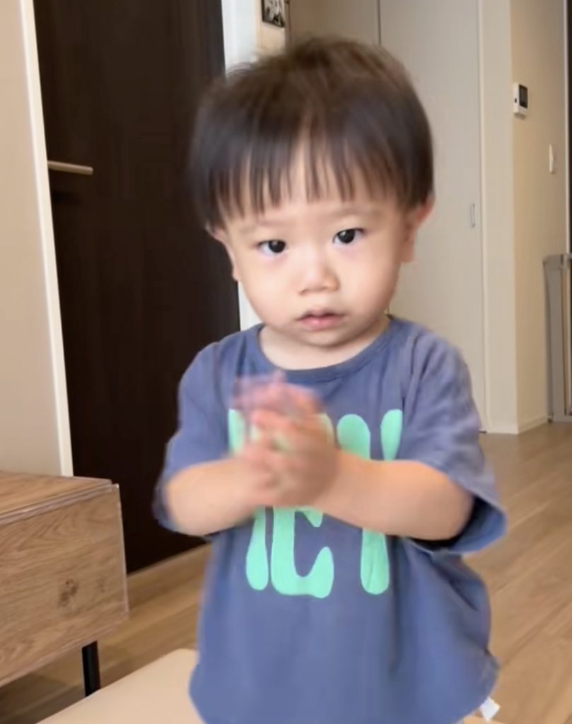 リビングで男の子を撮影しながら、「何歳?」と尋ねたママ。日常でよく聞くお決まりの質問だそうです。すると男の子は、ママをしっかり見つめながら、まずパチンッと手拍子!