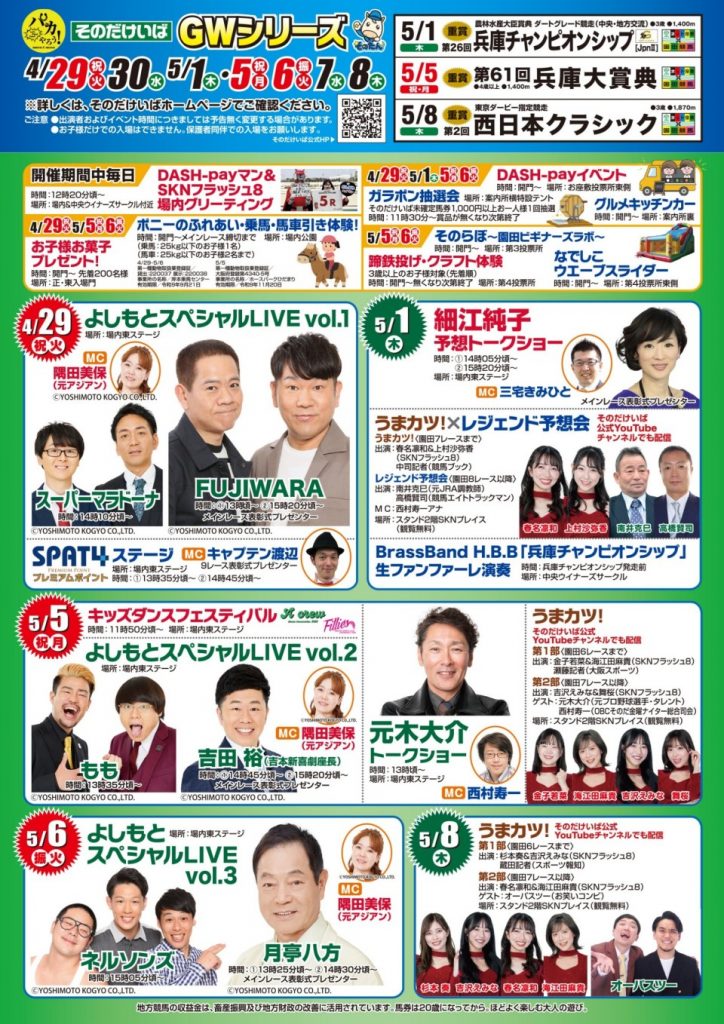 なお、4月29日から5月8日(水)まで開催される「そのだけいばGWシリーズ」では、5月1日(水)、5日(日・祝)、8日(水)に重賞レースが予定されています。イベントやレースの詳細は、園田競馬場の公式サイトをご確認ください。