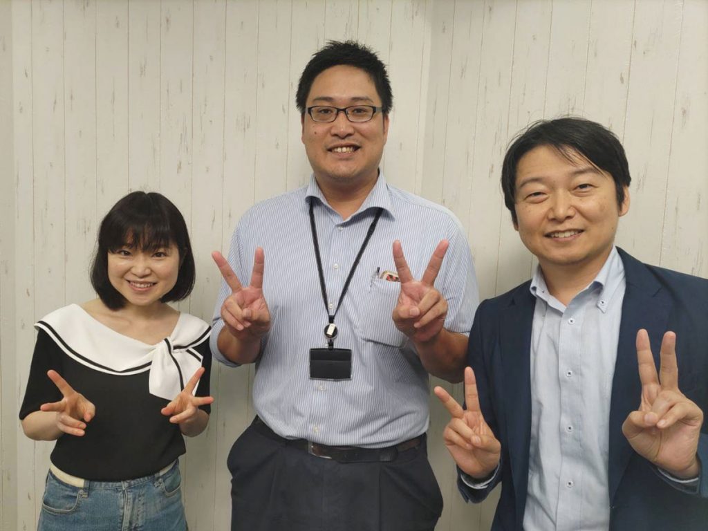 番組パーソナリティーのシンガーソングライター・川嶋あいさん(写真左)と、FM三重のアナウンサー・代田和也さん(同右)、営業部の鴨林正人さん(同中央)