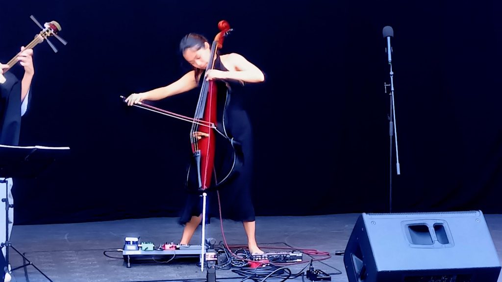 エレクトリック・チェロは、ロサンゼルスを拠点に活動するブリアナ・タムさん。自身の演奏をリアルタイムで録音し、その音を繰り返し(ループ)再生しながら、さらに新しい音を重ねる「ループステーション」を駆使して即興演奏するアメリカパビリオンの専属パフォーマー。