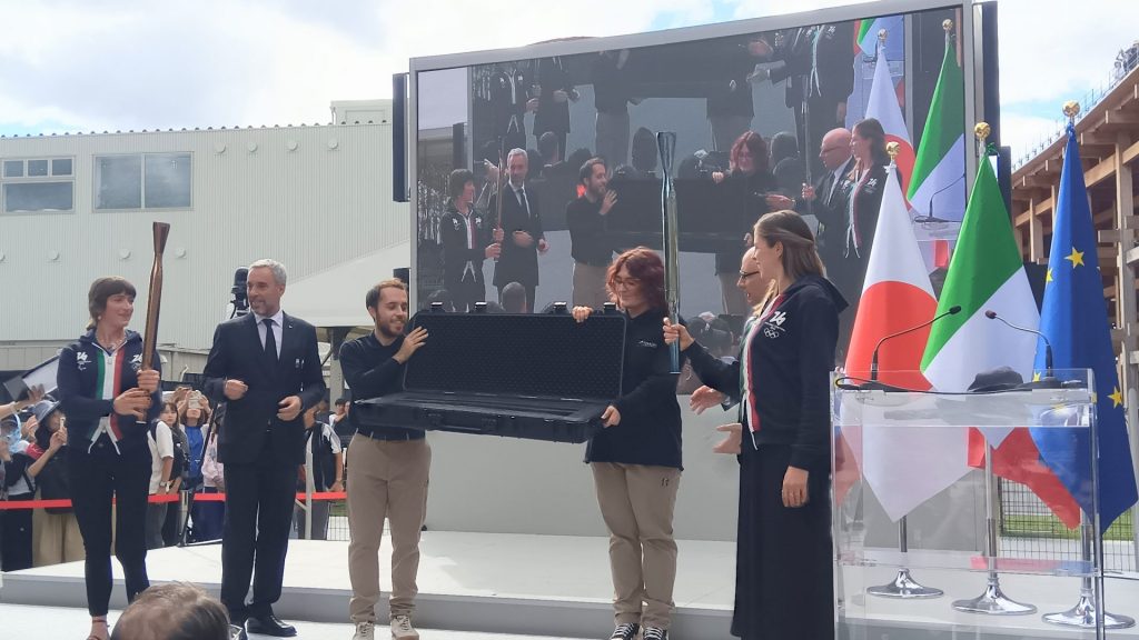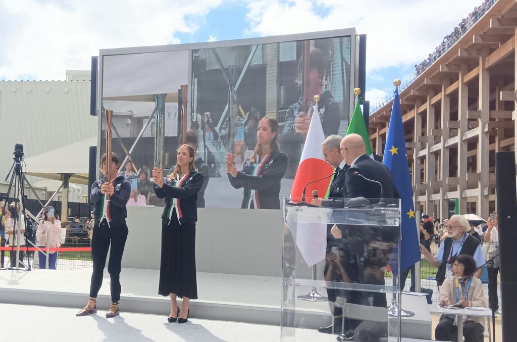 2人はパビリオンに展示されていた聖火トーチを特設ステージに運び、ケースに収納する引き継ぎセレモニーに参加した。