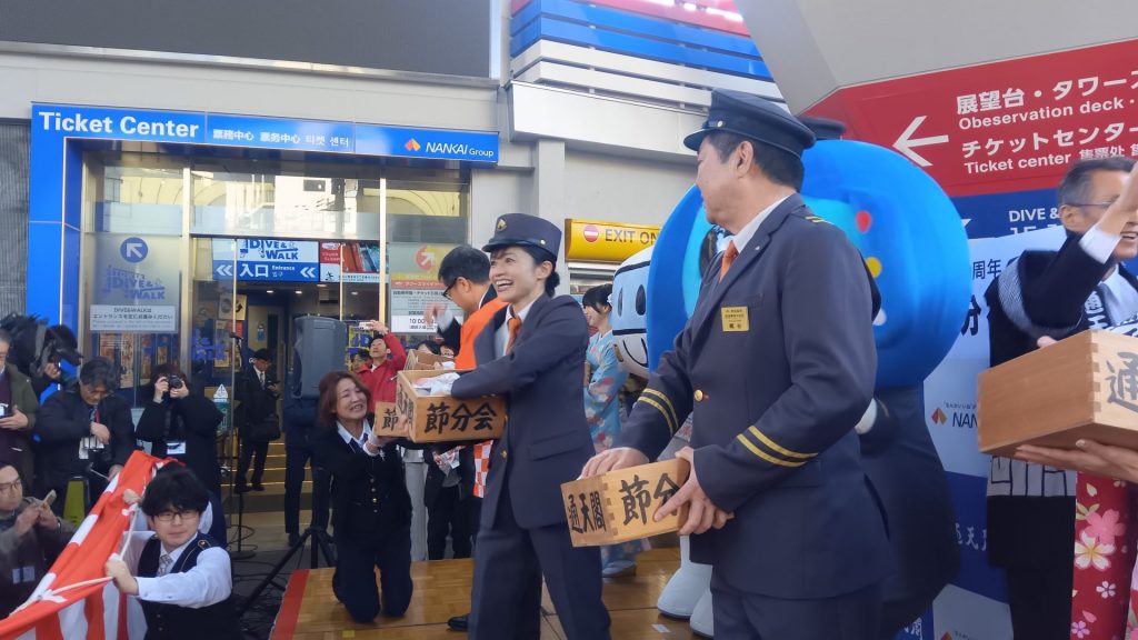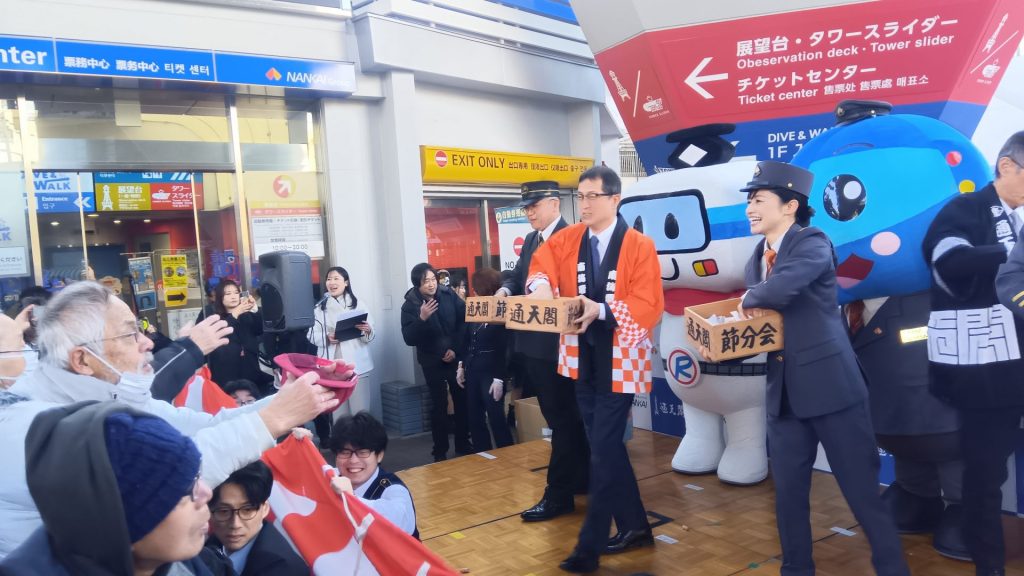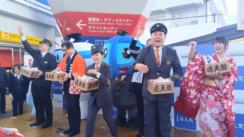 マスコットキャラクター・ラピートくん(南海電鉄)、せんぼくん(泉北高速鉄道)、鉄道ファンのタレント・斉藤雪乃さんらをゲストに招き、地上約100メートルの特別屋外展望台から豆まきを行った。