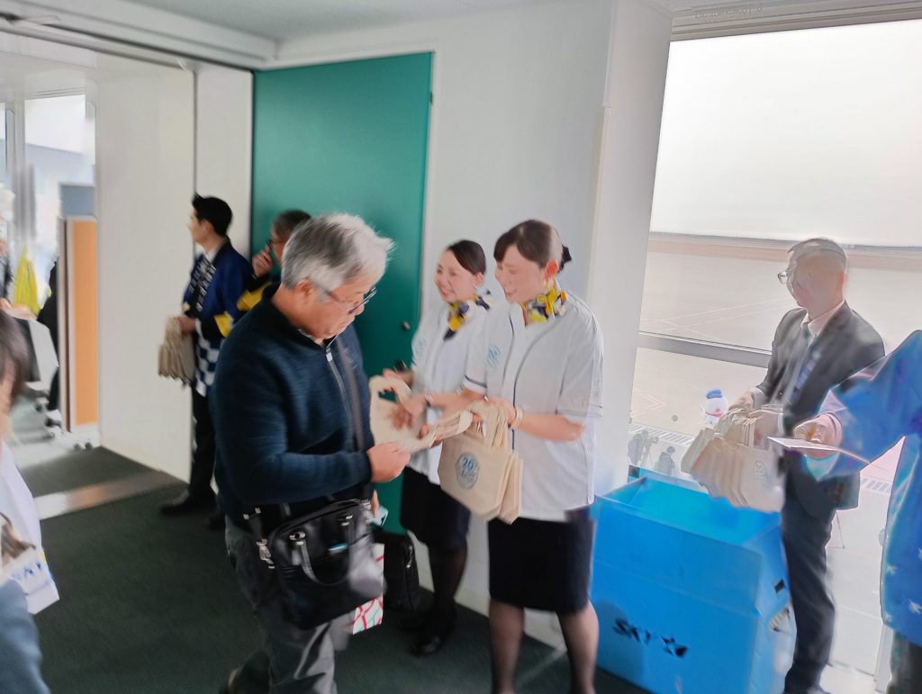 またこの日は、20周年を記念したノベルティが、搭乗者に配布されたほか、空港を運営する関西エアポートの公式キャラクター「そらやん」やエアラインスタッフらが横断幕を掲げ、出発便を見送りました。