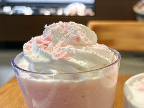 カップを受け取って最初に目をひいたのは、ホイップクリームの上に散らされた2色のさくらフレーバーシェイブ。花びらが舞い降りたかのようです。カップのなかは淡いピンクから白へのグラデーションになっていて、見た目から春の気分にひたることができます。