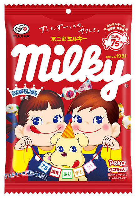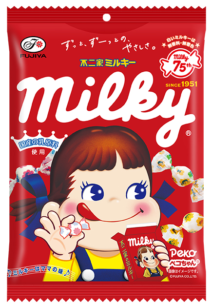 今回の新CM放送に合わせて、「ミルキー」はパッケージをリニューアルする。さらに、ミルキー発売75周年を記念して、鳥取県産のブランドトマトを使用した新商品と、75周年限定デザインのミルキー缶が登場。限定グッズが当たるキャンペーンも実施される。