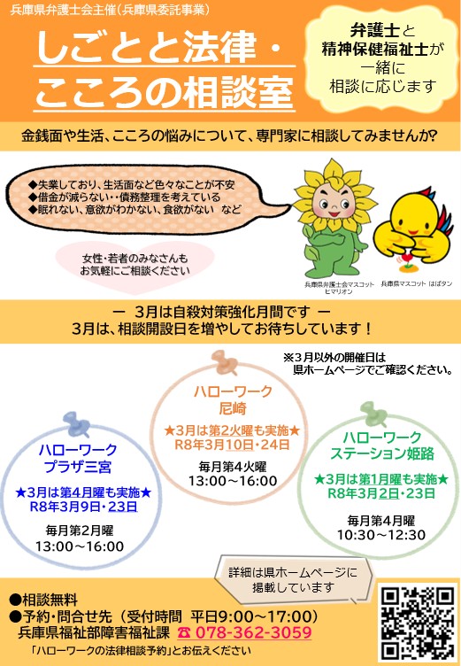 電話相談に加え、県内3カ所のハローワークでは「しごとと法律・こころの相談室」を開催。弁護士と精神保健福祉士が対面で相談に応じています。求職活動の不安や経済的な悩み、職場でのトラブルなど、小さな心配事でも相談可能です。予約・問い合わせは兵庫県福祉部障害福祉課(078-362-3059、平日9:00~17:00)まで。